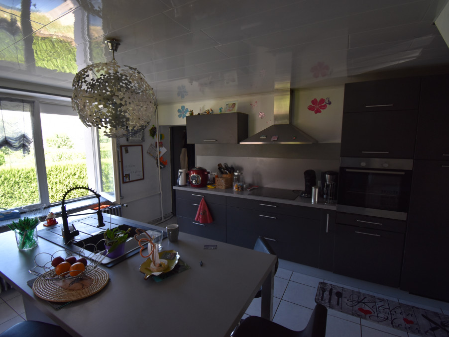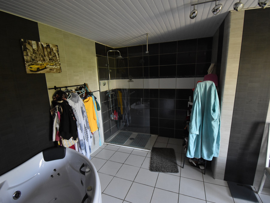 Au RDC, cuisine équipée, grand salon /séjour avec poële, wc, salle de bains (baignoire + douche italienne);
